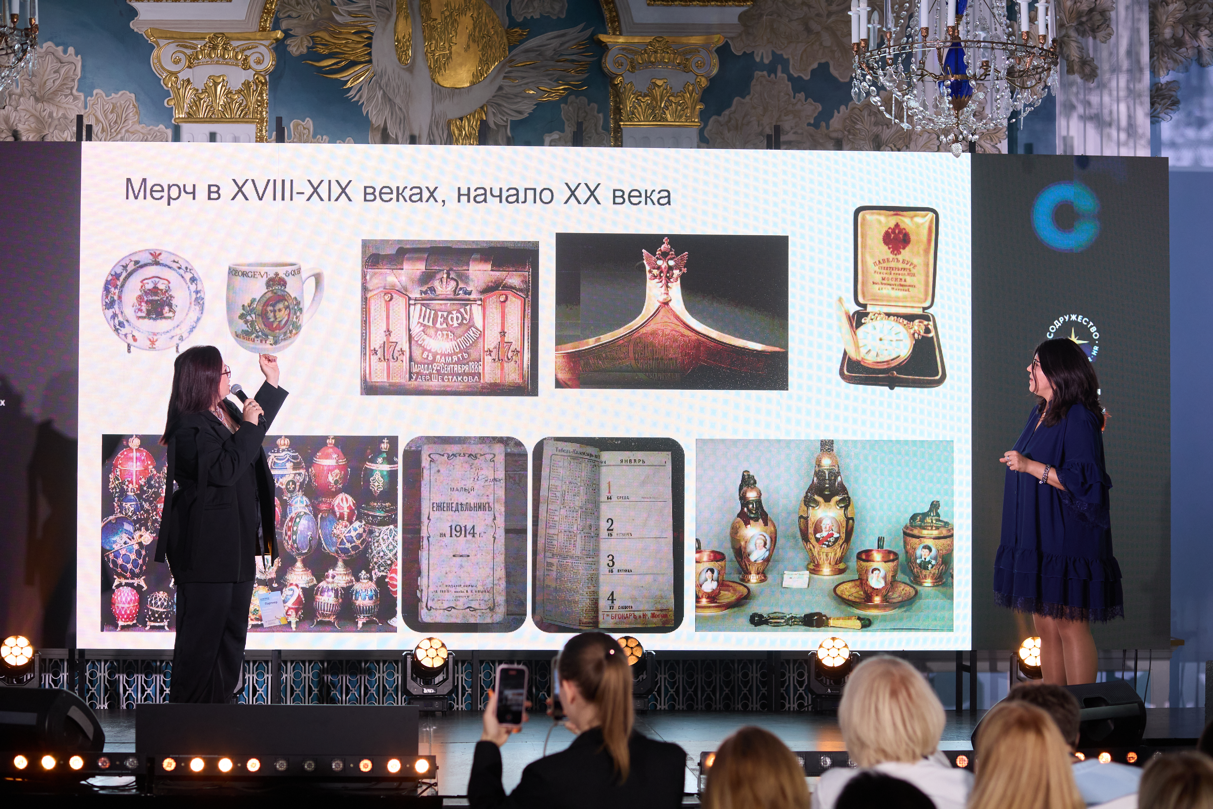 Марина Перебейносова, директор мерч-компании "Нью-Тон", и Виктория Карпучик, ведущий специалист по развитию, погрузили гостей в историю мерча — от его самых первых форм до привычных нам сегодня решений.